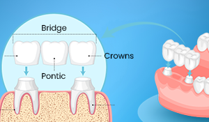 Crowns can also be used to create a lifelike replacement for a missing tooth. This is done with bridgework, which spans the space of the missing tooth and requires at least three crowns. Two of those crowns will be placed over healthy teeth on either side of the missing tooth; these healthy teeth are referred to as abutment teeth. The two crowned abutment teeth become supports for a third crown placed in between them; that third crown is referred to as a pontic. If more than one tooth is missing, more crowns will be needed to bridge the gap in between the abutment teeth.